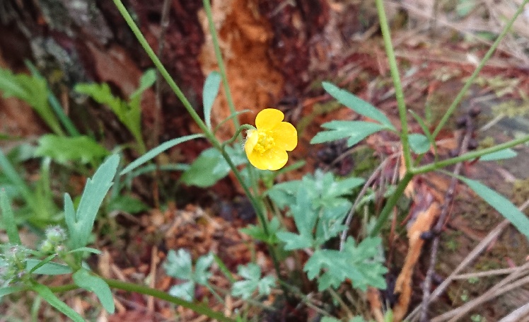 寂しい感じですが、ウマノアシガタです。今日は太陽の光がないのでわかりにくいですが、花びらの内側がバターを塗ったようにテカテカ光ってるんですよね。一昨年はすごく群生していたのですが、今年はまばらに咲きそうです。